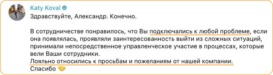 На этой странице собрана вся обратная связь, связанная с взаимодействием со мной. Вы можете оставить отзыв о нашей с Вами проделанной работе.